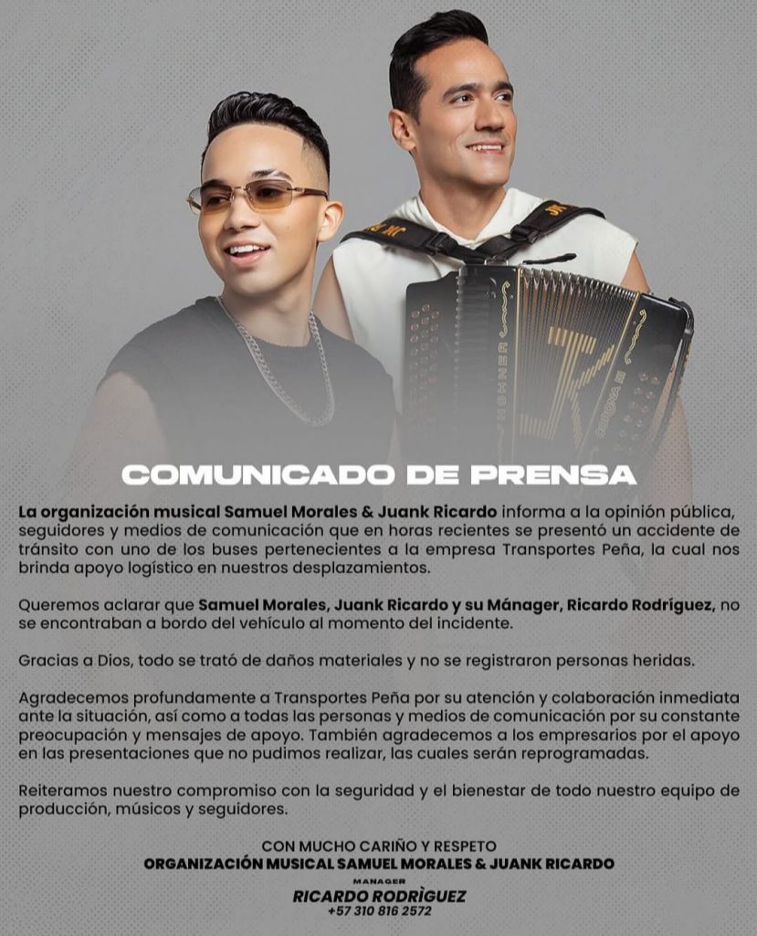 Este accidente generó conmoción y preocupación por parte de los seguidores del heredero de Kaleth Morales quienes creyeron que se volvería a repetir la tragedia del padre. Sin embargo, el lunes 13 de octubre, la organización musical de Samuel Morales y Juank Ricardo dio a conocer un comunicado de prensa donde explica que ni él, ni su acordeonero ni su mánager se encontraban en el bus y que solo hubo daños materiales.