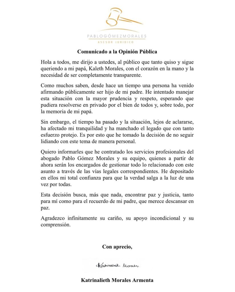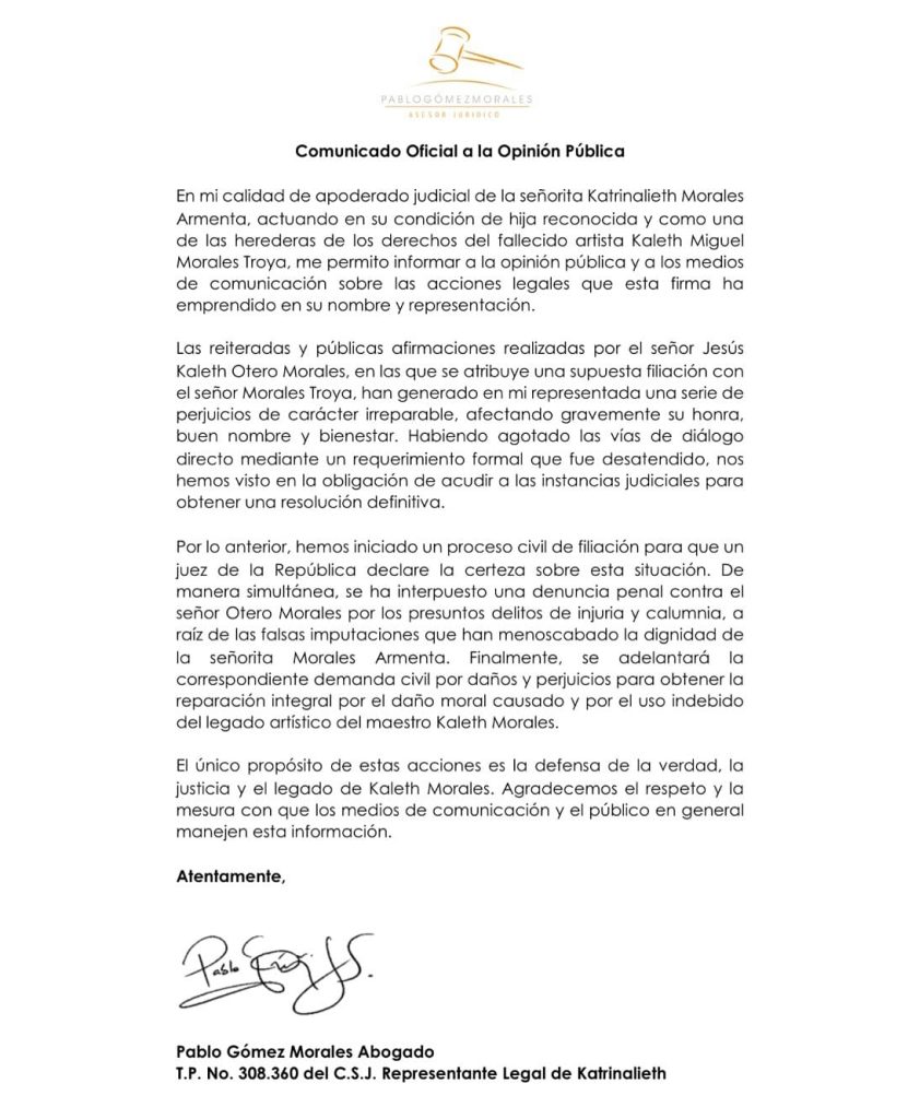 Para proteger el legado de su padre y de su familia, Katrinalieth Morales empezó un proceso judicial donde se realiza una denuncia penal a Jesús Kaleth por injuria y calumnia y una demanda civil por daños y perjuicios por el uso indebido del legado del artista Morales.